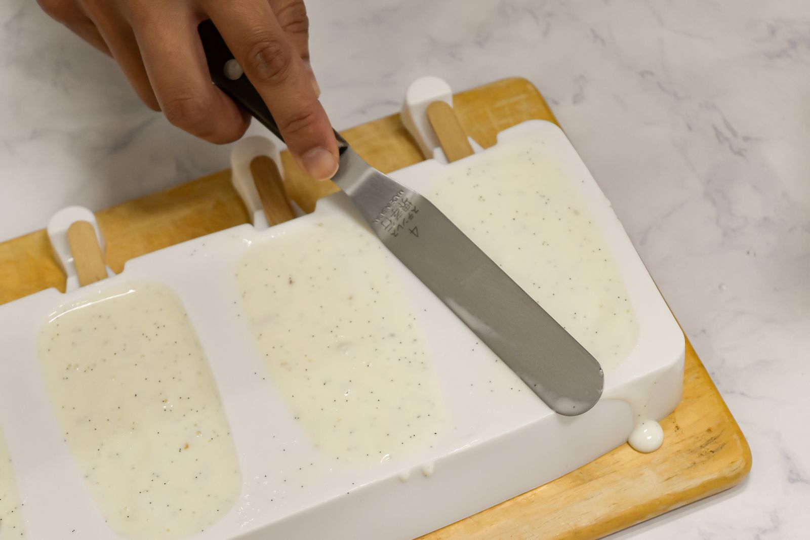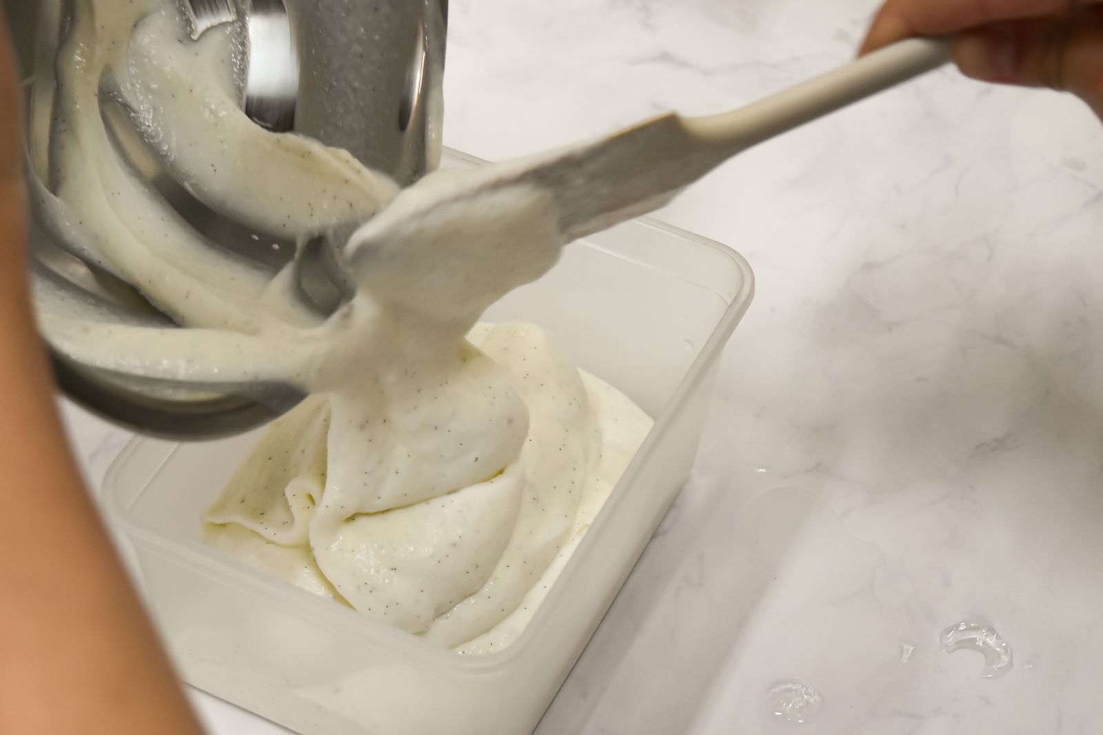 將冰淇淋液冰鎮、攪拌至約10度後加入香草精